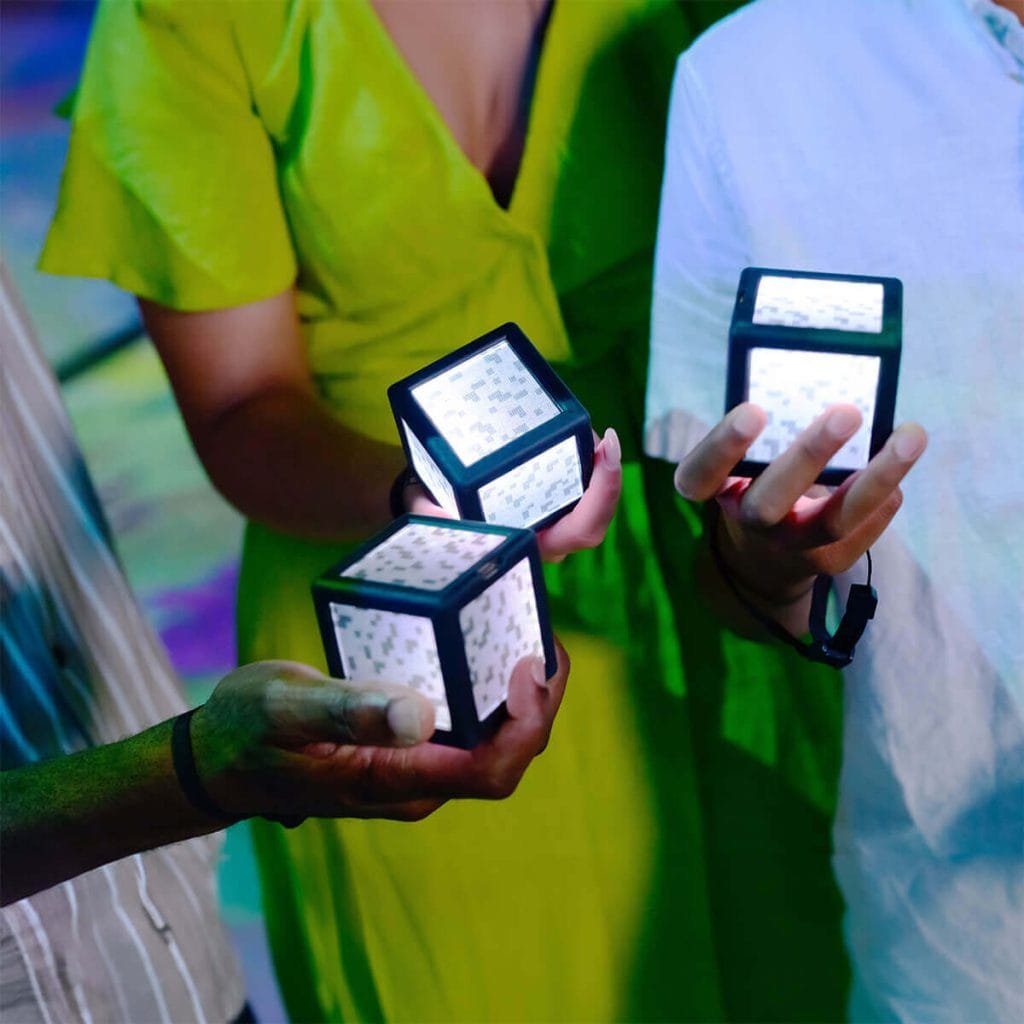 Proyecciones masivas de biomas. Tres biomas completos — bosque, aldea y mina — recreados con proyecciones de alta resolución que te meten de lleno en el universo de cubos. Si alguna vez quisiste saber cómo se siente estar dentro del juego, aquí está la respuesta.