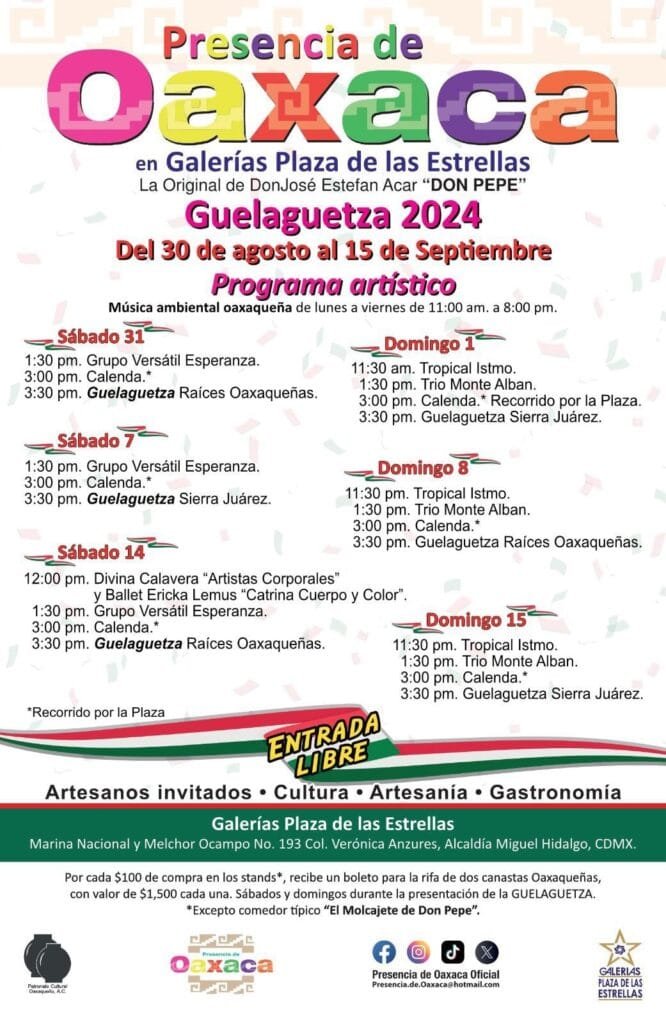 La Presencia de Oaxaca en Galerías Plaza de las Estrellas es un evento imperdible para quienes desean experimentar la cultura, el arte, la gastronomía y las tradiciones de Oaxaca en un solo lugar. Ven y vive una celebración única que honra la riqueza de una de las culturas más vibrantes de México. ¡Te esperamos para compartir esta experiencia inolvidable!